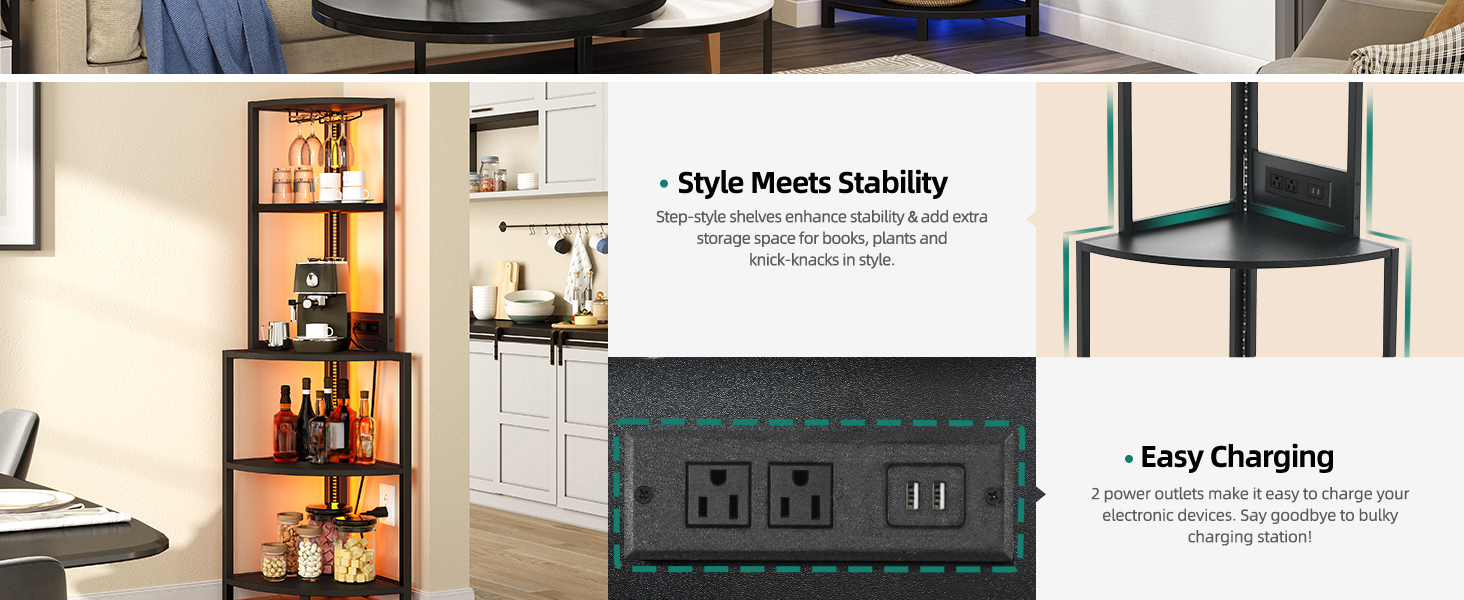 The YITAHOME Corner Shelf is a multifunctional 5-tier corner bar rack designed for modern living. It features 2 power outlets, RGB LED lights, and a glass holder, making it a stylish and practical addition to any room. With a sleek black finish and safety features, this corner shelf is perfect for organizing your space while adding a touch of elegance.